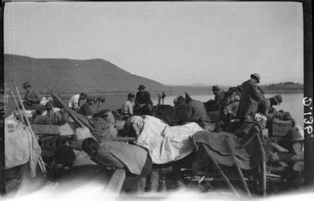 Ämnesord: arbetare, forskningsexpeditioner, berg, forskningsresande, strömmande vatten, stockar, flotta, åror, strandlinje, kistor |