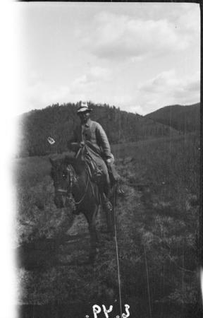 Ämnesord: norrmän, skog, ängar, forskningsresande, ryttare, häst, betsel, stigbyglar |