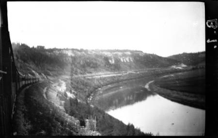 Ämnesord: järnvägar, berg, skog, floddalar, buskar, tåg |