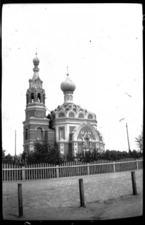 Ämnesord: gator, kyrkobyggnader, buskar, staket, telegrafi |
