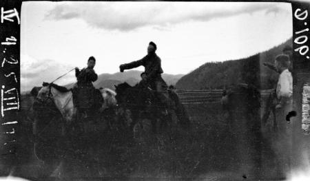 Ämnesord: berg, moln, forskningsresande, urbefolkning, ryttare, häst, huvudbonader, staket, betsel |