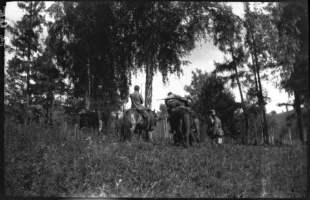 Ämnesord: skog, ängar, forskningsresande, gevär, ryttare, häst, bagage, björk |