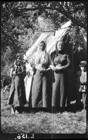 Ämnesord: kvinnor, pojkar, klädsel, ryssar, tält, bälten, lövträd |