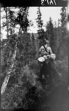 Ämnesord: skog, forskningsresande, ryttare, häst, lärkträd, tält, ryggsäckar |