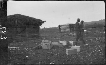 Ämnesord: forskningsresande, gårdsplaner, kistor, träkonstruktioner, timmer, skjul |