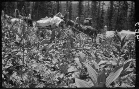 Ämnesord: blommor (växter), arbetare, skog, forskningsresande, häst, gran, hästfordon, pålar |
